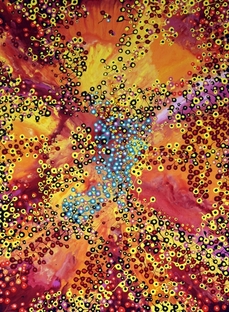The acrylics, which hang in the hallway of the clinic, show a cell that is permeated by multiple black dots. These represent the invasion of the HIV protease enzyme, which is essential to survival of the virus. Blue dots on the canvas are used to capture the image of the fighters – the protease inhibitors that stop cell growth. Gradually, the blue dots spread and overtake the nasty enzyme. In the last painting, a bright yellow canvas shines through, as the enzyme is destroyed (though remnants of the virus remain, as current therapies never completely eradicate it).
