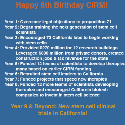 Eight years ago today, 59% of California voters said yes to funding stem cell research in the state. That vote created the state’s stem cell agency, the California Institute for Regenerative Medicine. Since then, we had to fight off legal hurdles, encourage California researchers to start working in the field, and build those researchers quality space to carry out their research.