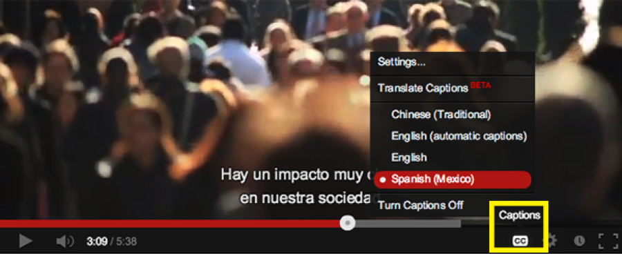 Siga adelante y probar esta nueva función con nuestra última video “Parkinson: Pregunte al experto en células madre”: (1) Navegue hasta el vídeo aquí . (2) A continuación, haga clic en el botón “CC” que aparece en la ventana de vídeo como se indica en el cuadro amarillo en la imagen de arriba. (3) A continuación, en el menú que aparece, seleccione Chino, Inglés o español. [NOTA: Evite el “inglés (subtítulos automáticos)” selección].