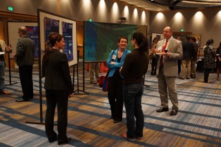 | Attendees talking around disease-focused posters at CIRM’s public meeting last week |
