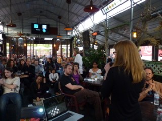 The audience was a really diverse group, drawn by a shared fascination with science and an interest in stem cells. Mike Higashi said he has a “general curiosity about science and really liked the deep background” he got from the talk. Atif Khan was visiting from Pakistan, “I’m a biology student and don’t know a lot about stem cells right now but want to learn because I’m thinking of studying them after I graduate.” For Madeline Detelich it was a date night! She was visiting her boyfriend and he wanted to take her somewhere “fun and cheap” (they are students with little money). Madeline is a biochemistry major and said the talk was “great fun and it definitely made me think a lot more about human anatomy and disease therapy. Most of my work is with e-coli so this was very different for me.”