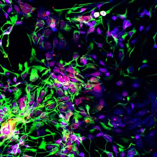 | Motor neuron progenitors (green) derived from human embryonic stem cells. Death of motor neurons is a hallmark of ALS. Image: Sharyn Rossi, Hans Keirstead Lab at the University of California, Irvine |