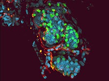| Staining of slow-cycling sweat gland cells (green) with the protein laminin (red) and the fluorescent stain DAPI (blue) Image by Yvonne Leung |