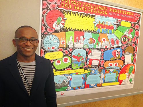 However, what was really cool is Ubaka’s poster describing his project. When I first saw it I thought it was a board game. However, it is a very creative way of engaging people and describing the important questions one needs to consider when using peoples cells and health information. Some of his questions include: