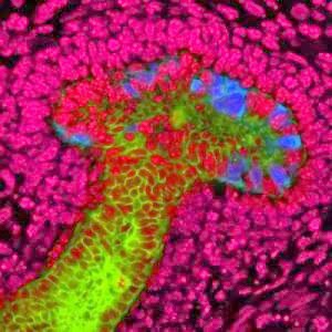 | Kidney bud created from human stem cells (in blue and green). Cells in red are mouse kidney cells. Courtesy of the Salk Institute for Biological Studies |