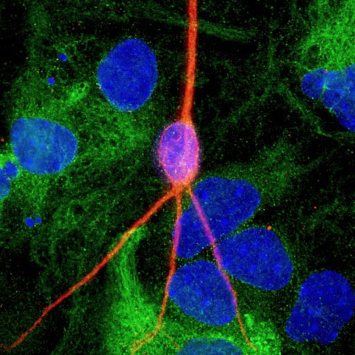 Here nerves (red) grow out of neural stem cells, but the current work coaxed other adult brain cells to directly become functioning nerves.