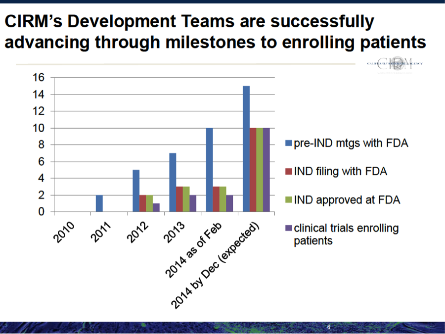 For proof of that here is one slide from a presentation that Dr. Ellen Feigal, our Senior Vice President for Research and Development, made at our March Board meeting. It shows how the Disease Teams we are funding are moving rapidly towards clinical trials. In fact of the first 14 Disease Teams we funded, nine have successfully progressed to the point where they are either already enrolling patients for clinical trials or expect to be enrolling patients by the end of this year, and they just began the CIRM part of their projects in 2010.