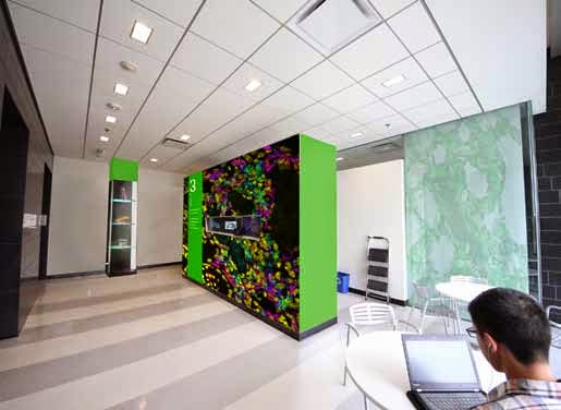 “a designed environment that would enliven the space, enrich the researchers’ experience, convey a sense of the current research to visitors, and be visually energizing and engaging.”