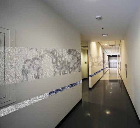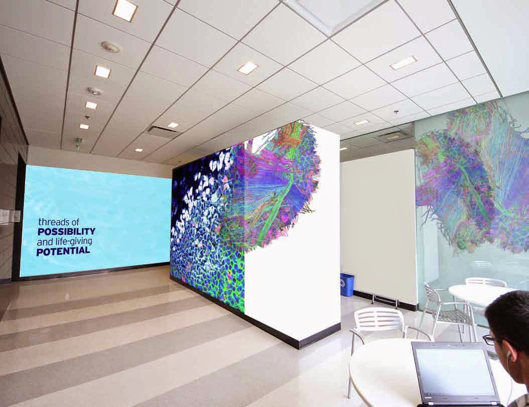 They came up with a number of different proposals using different stem cell images and colors to brighten up the building and help give visual clues as to where you are in the facility. They wanted those colors and images to be part of the experience from the moment you walked in the lobby, to getting out of the elevator and walking down a corridor.