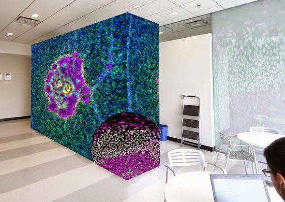 Then they got to work, coming up with ways of incorporating the imagery from stem cell research into the actual building itself. The students said they were inspired by the way the researchers worked together, and how the building itself seemed to promote that kind of collaboration because of its design. So, they set out to mirror that idea of collaboration by creating: