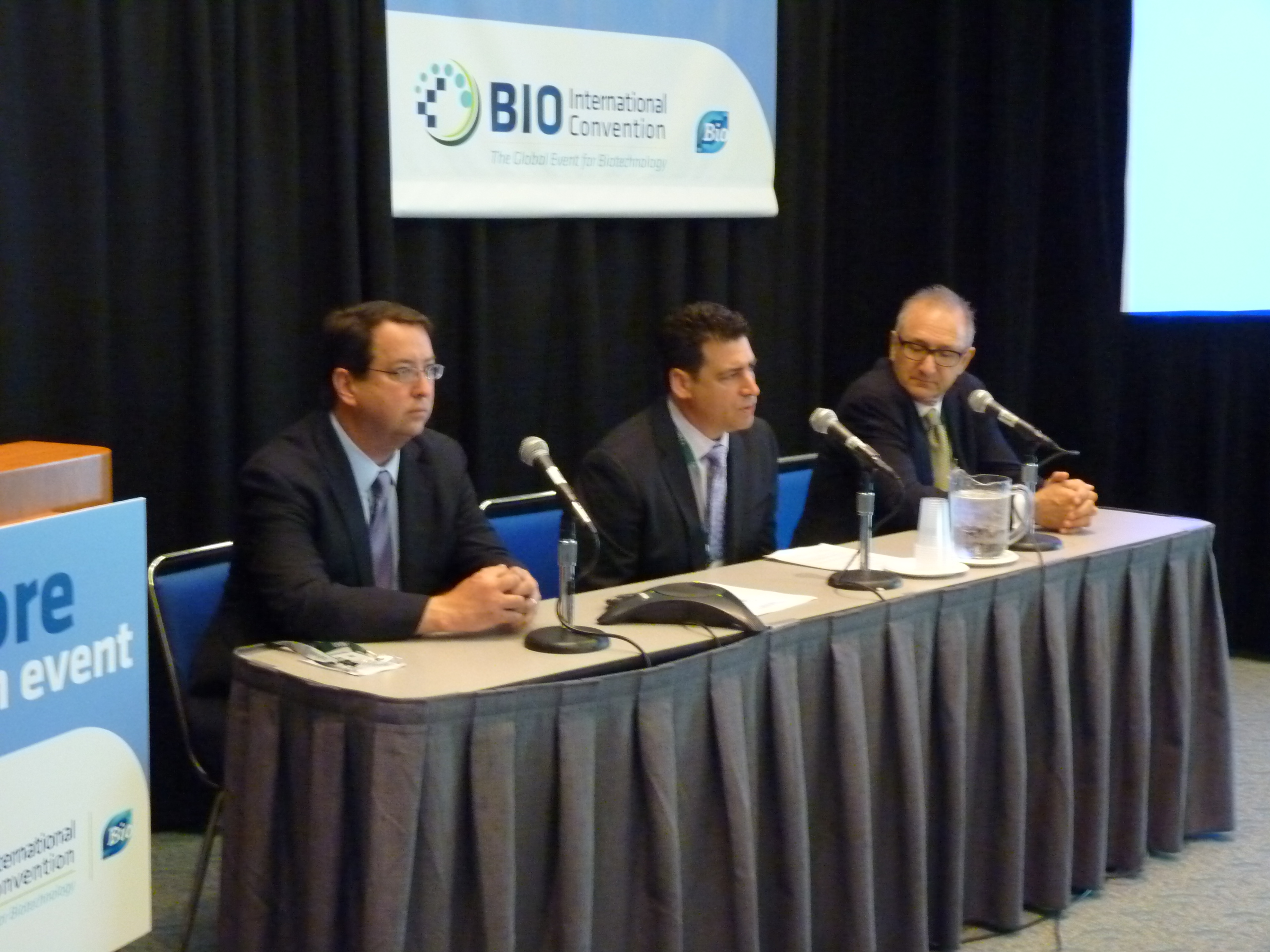 Left to Right: CIRM President and CEO C. Randal Mills, Calimmune CEO Louis Breton, Calimmume Chief Scientific Officer Geoff Symonds at today's news conference in San Diego.