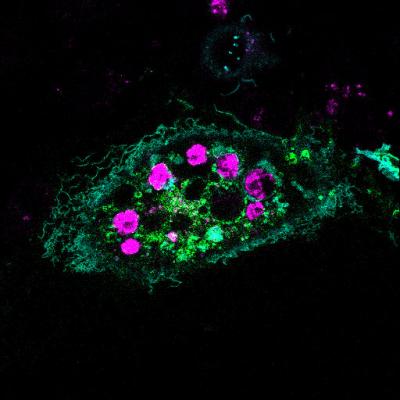 A healthy cell (green) that has recognized and engulfed dying cells (purple) is shown. [Credit: Toru Komatsu/University of Tokyo]
