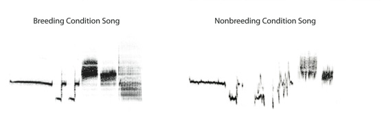Audio tracings of the sparrow’s song show its degradation after breeding season each year. (image: T. Larson/Univ. of Washington)
