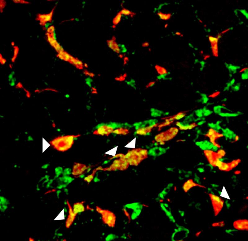 Scar forming cells (in red) in a region of the injured heart expressing blood vessel cell marker in green and thus appearing yellow (see arrows). This study observed that approximately a third of the scar-forming cells in the injured region of the heart adopted “blood vessel” cell-like characteristics. [Credit: Dr. Arjun Deb/Nature]