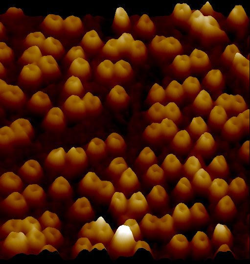 These are nuclear pores imaged by atomic force microscopy, appearing as a craterlike landscape in which each crater corresponds to a pore of ~100 nm diameter. [Credit: UCL]