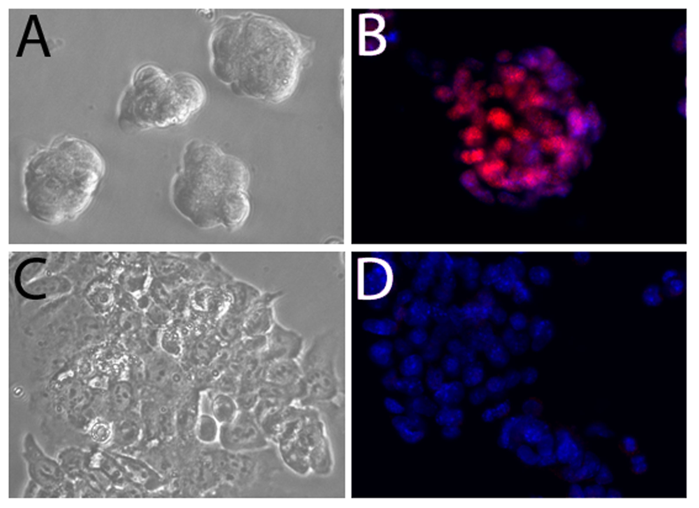 Mouse embryonic stem cells grown in a round colony of cells (A) and express Sox2 (B), shown in red. Sox2 control region (SCR)-deleted cells have lost the typical appearance of embryonic stem cells (C) and do not express Sox2 (D). [Credit: Jennifer Mitchell/University of Toronto]
