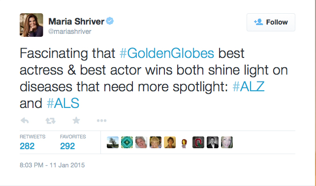 The fact that the two lead acting awards put spotlight on these diseases was not lost on the patient advocacy communities. For example, Maria Shriver tweeted shortly after the awards ceremony: