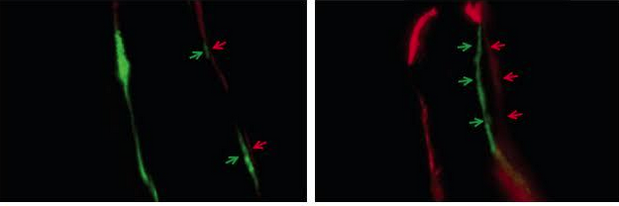 Fluorescent imaging of mouse spines. Treatment with NELL-1 (right) shows greater bone formation compared to untreated mice (left). Credit: Broad Stem Cell Research Center