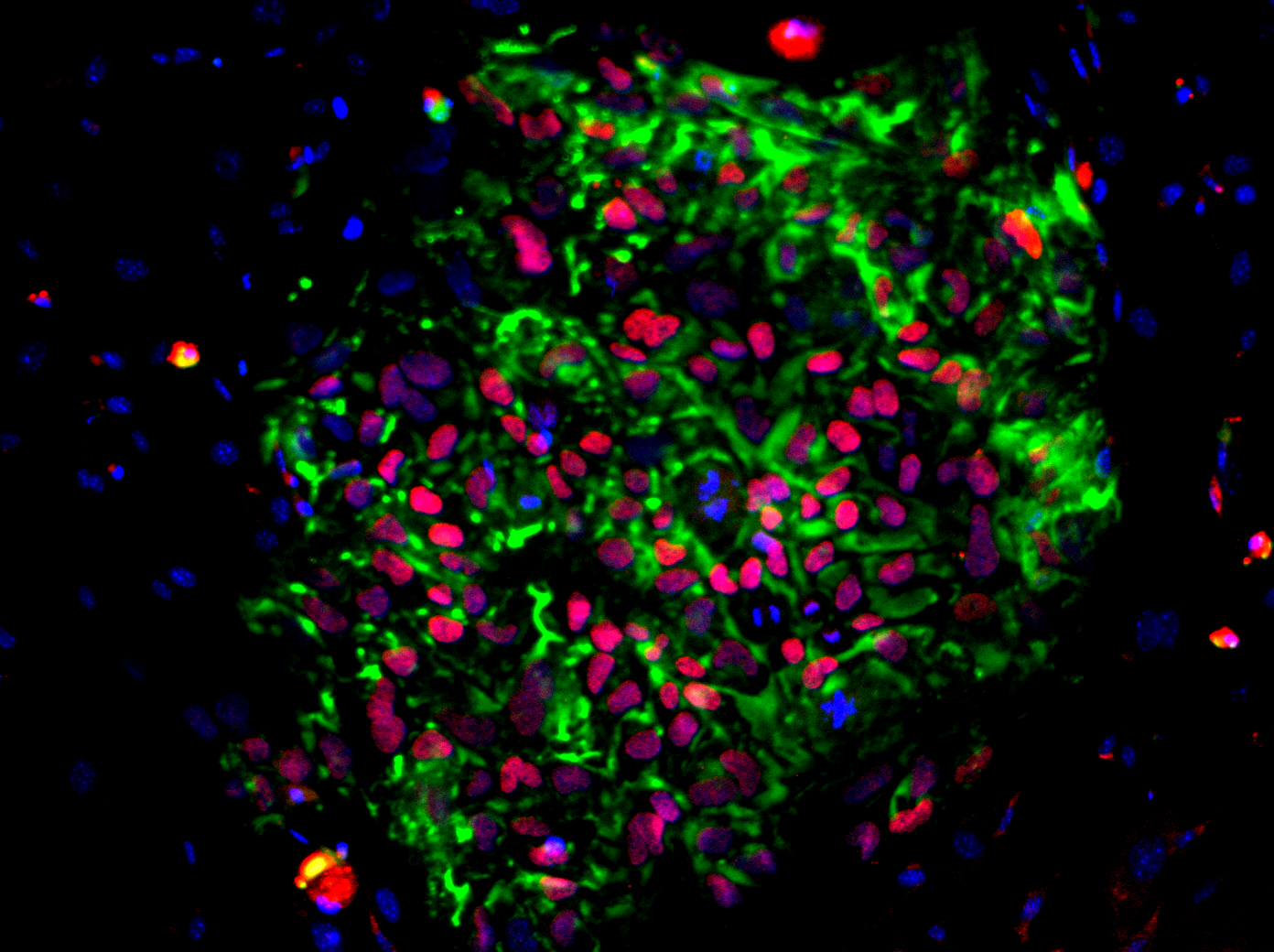 iPS cells reprogrammed from a woman’s skin. Blue shows nuclei. Green and red indicate proteins found in reprogrammed cells but not in skin cells (credit: Kathrin Plath / UCLA).