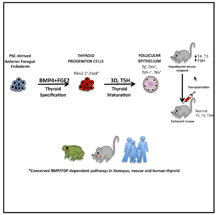 With the bases loaded, the authors hit a grand slam by using BMP4 and FGF2 to generate thyroid progenitor cells from human embryonic stem cells (ESCs) and induced pluripotent stem cells (iPSCs) derived from the skin cells of both healthy individuals and patients with hypothyroidism.