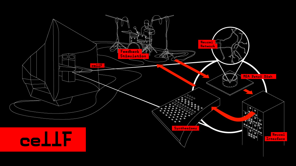 “Music is fed into the neurons as electrical stimulations and the neurons respond by controlling the synthesizer, creating an improvised post-human sound piece.”