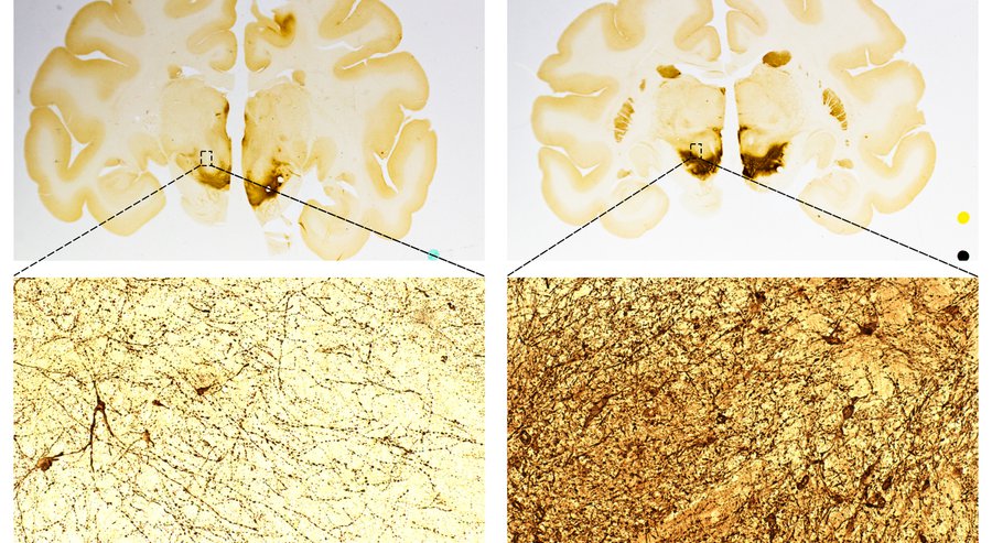 A comparison of primate brains to show an increase in the number of neurons after treatment with ISCO’s stem cells. The left side is a control sample. The right side is from a treated brain. — International Stem Cell Corp.