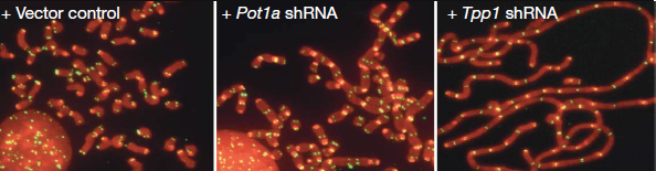 Telomere deprotection results in chromosomes that are linked together (right) instead of separate (left). (Source Nature: Denchi et al., 2007)