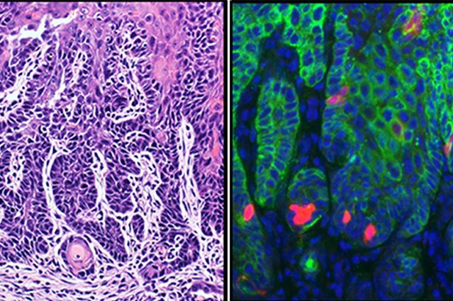 At left, head and neck squamous cell carcinoma invasive growth, and at right, cancer stem cells (shown in red) in head and neck squamous cell carcinoma. (Image Demeng Chen and Cun-Yu Wang/UCLA)