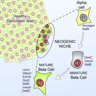 But it turns out there is another cell type in the pancreas that is capable of making beta cells and they look like a teenage, less mature version of beta cells. The UC Davis team identified these cells in mice and in samples of human pancreas tissue. These cells hangout at the edges of structures called islets, which are clusters of beta cells within the pancreas. Upon further inspection, the scientists found that these immature beta cells can secrete insulin but cannot detect blood glucose like mature beta cells. They also found their point of origin: the immature beta cells developed from another type of pancreatic cell called the alpha cell.