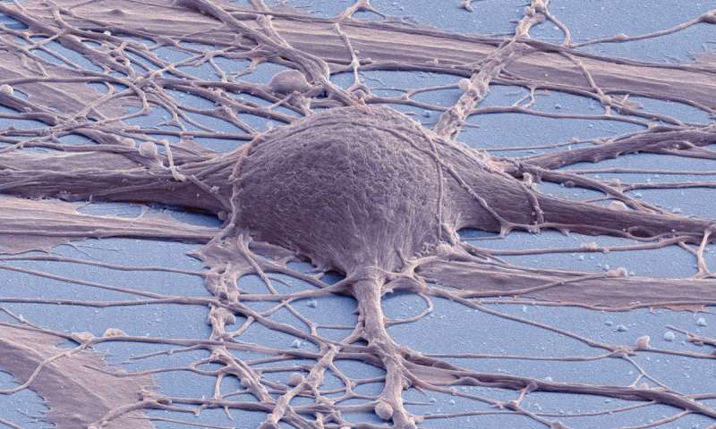 A false color scanning electron micrograph of cultured human neuron from induced pluripotent stem cell. Credit: Mark Ellisman and Thomas Deerinck, UC San Diego.