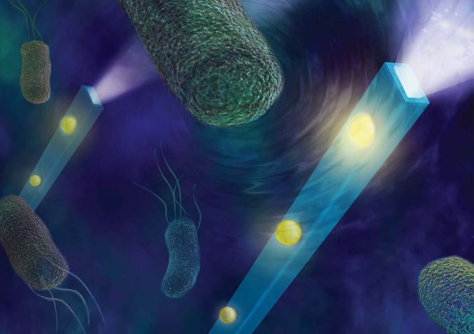An artist’s illustration of nano optical fibers detecting the minuscule forces produced by swimming bacteria. Credit: Rhett S. Miller/UC Regents