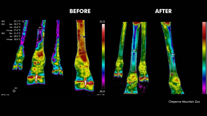 Before treatment, thermograph shows inflammation (red/yellow) in Mahali’s left front foot (seen at far right of each image); after treatment inflammation resolved (blue/green). Photos: Cheyenne Mountain Zoo