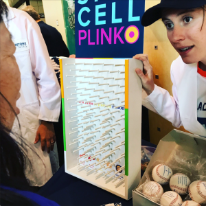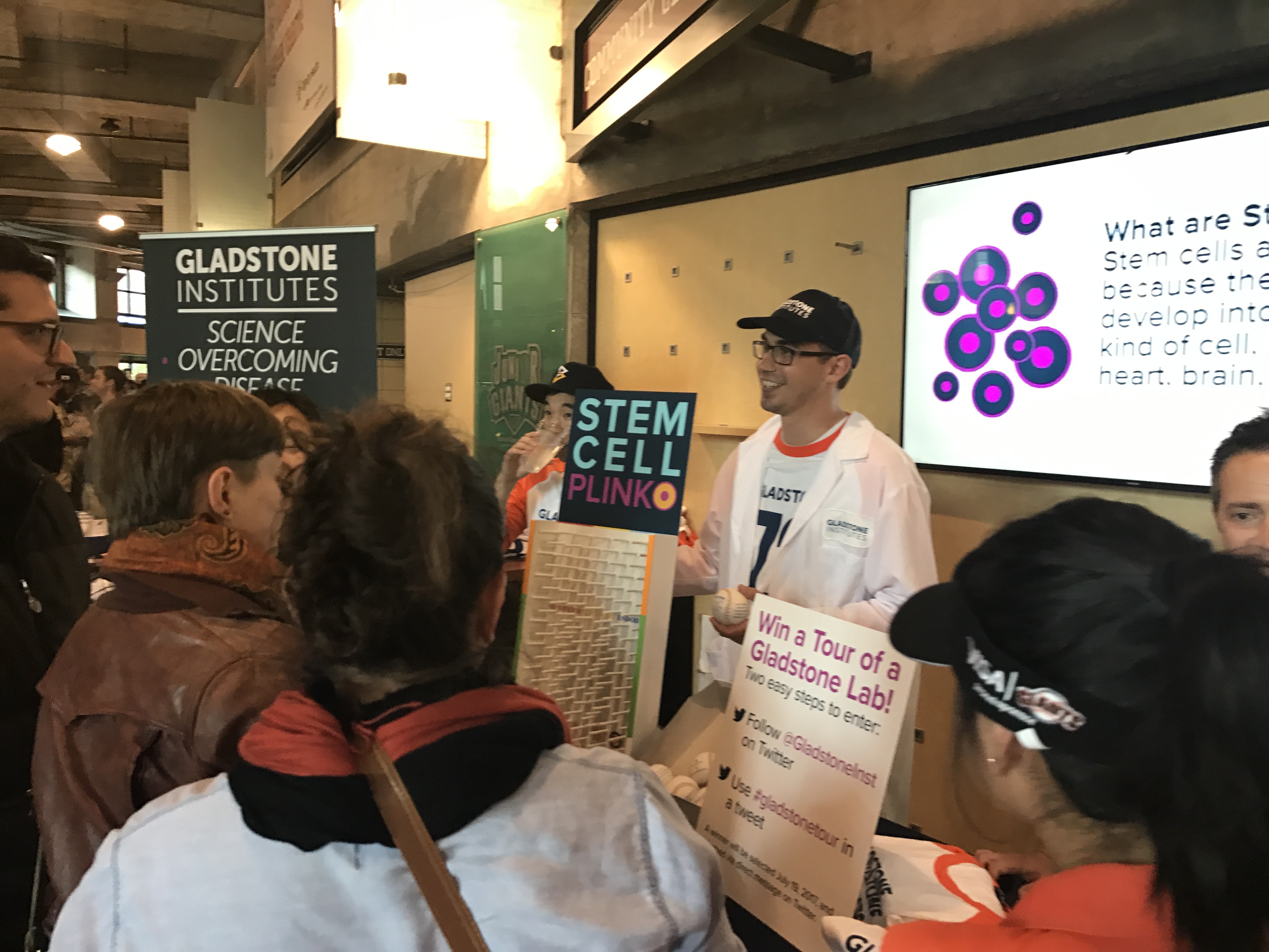 The Gladstone team had a snazzy stem cell booth at the Giant’s Community Clubhouse with fun science swag and educational stem cell activities for fans of all ages. One of the activities was a game called “Stem Cell Plinko” where you drop a ball representing a pluripotent stem cell down a plinko board. The path the ball travels represents how that stem cell differentiates or matures into adult cells like those in the heart.