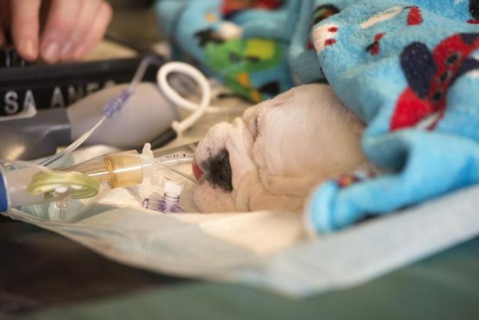 These adorable English bulldog puppies are named Darla and Spanky, and they were born with a birth defect called spina bifida where the bones and tissue surrounding the spinal cord fail to fuse completely. Spina bifida occurs in 1500-2000 children in the US each year and can cause serious problems such as paralysis and issues with walking, cognition, and bladder or bowel control. Dogs born with this condition usually cannot use their hind legs, and as a sad consequence, are typically put down at a young age.