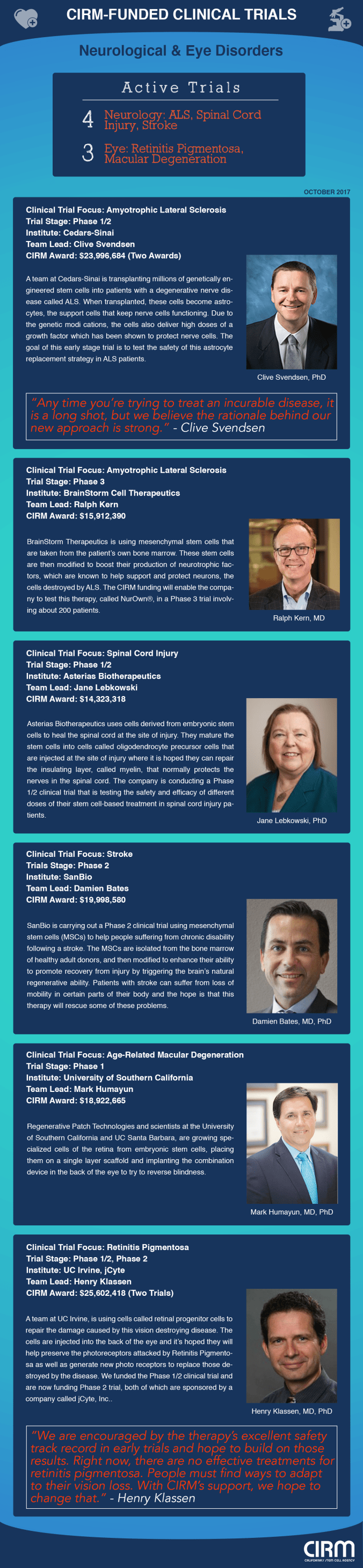 Today we are featuring CIRM-funded trials in our neurological and eye disorders portfolio.  CIRM has funded a total of nine trials targeting these disease areas, and seven of these trials are currently active. Check out the infographic below for a list of our currently active trials.