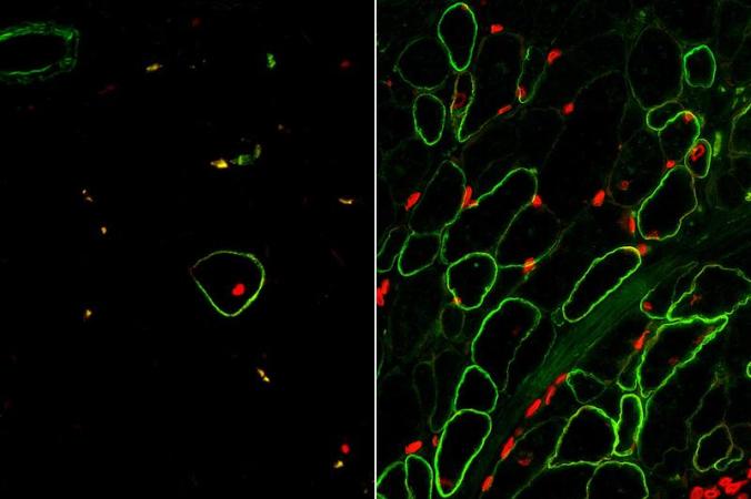 By comparing the proteins expressed on the cell surface of human fetal and adult muscle cells, the team identified two proteins, ERBB3 and NGFR, that represented a regenerative population of skeletal muscle cells. They used these two markers to isolate these regenerative muscle cells, but found that the muscle fibers they created in a lab dish were smaller than those found in human muscle.