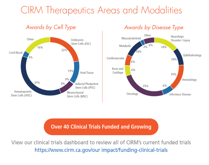 In addition to funding clinical trials, CIRM brings in critical expertise and resources for these programs. Clinical Advisory Panels (CAPs), composed of CIRM science officers, external experts and patient representatives, meet on a quarterly basis for each program to help them overcome obstacles and meet project milestones. CIRM has created the Stem Cell Center – a stem cell-specific research organization that helps investigators navigate the best regulatory pathways, provides access manufacturing resources, operational clinical trial support and strategic resources for delivering successful products to patients.