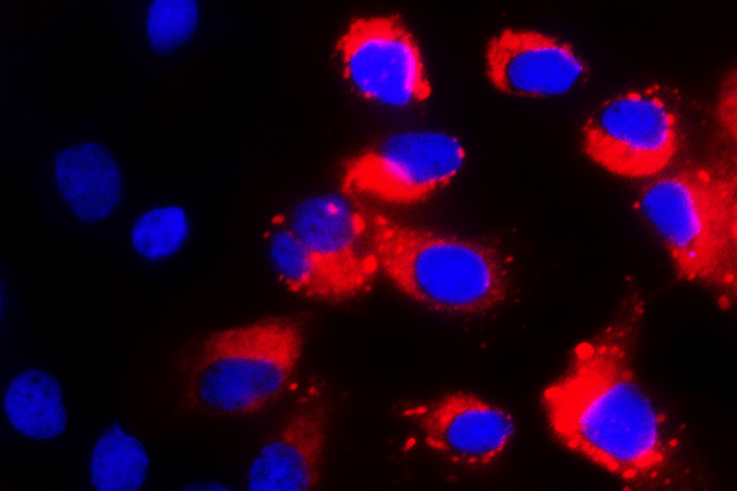 Stem cells lacking their protective genes are susceptible to infection by the dengue virus, in red. (Rockefeller University)