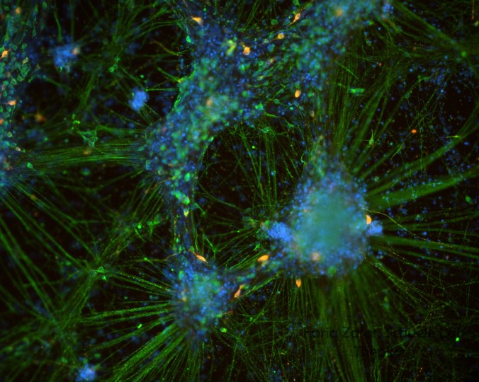 Dopaminergic neurons derived from human iPSCs shown in green, yellow and red. (Image credit: Atossa Shaltouki, Stanford)