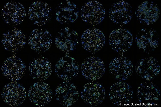 High throughput differentiation of dopaminergic neuron progenitors in microbioreactor chambers in Scaled Biolabs’ cell optimization platform. Different chambers receive different differentiation factors, so that optimal treatments for conversion to dual-positive cells can be determined (blue: nuclei, red: FOXA2, green: LMX1A).