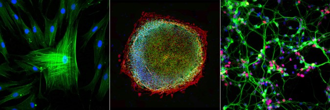 Skin cells from a Parkinson’s patient (left) were reprogrammed into induced pluripotent stem cells (center) that were matured into dopaminergic neurons (right) to model Parkinson’s disease. (Image credit: Jeanne Loring)