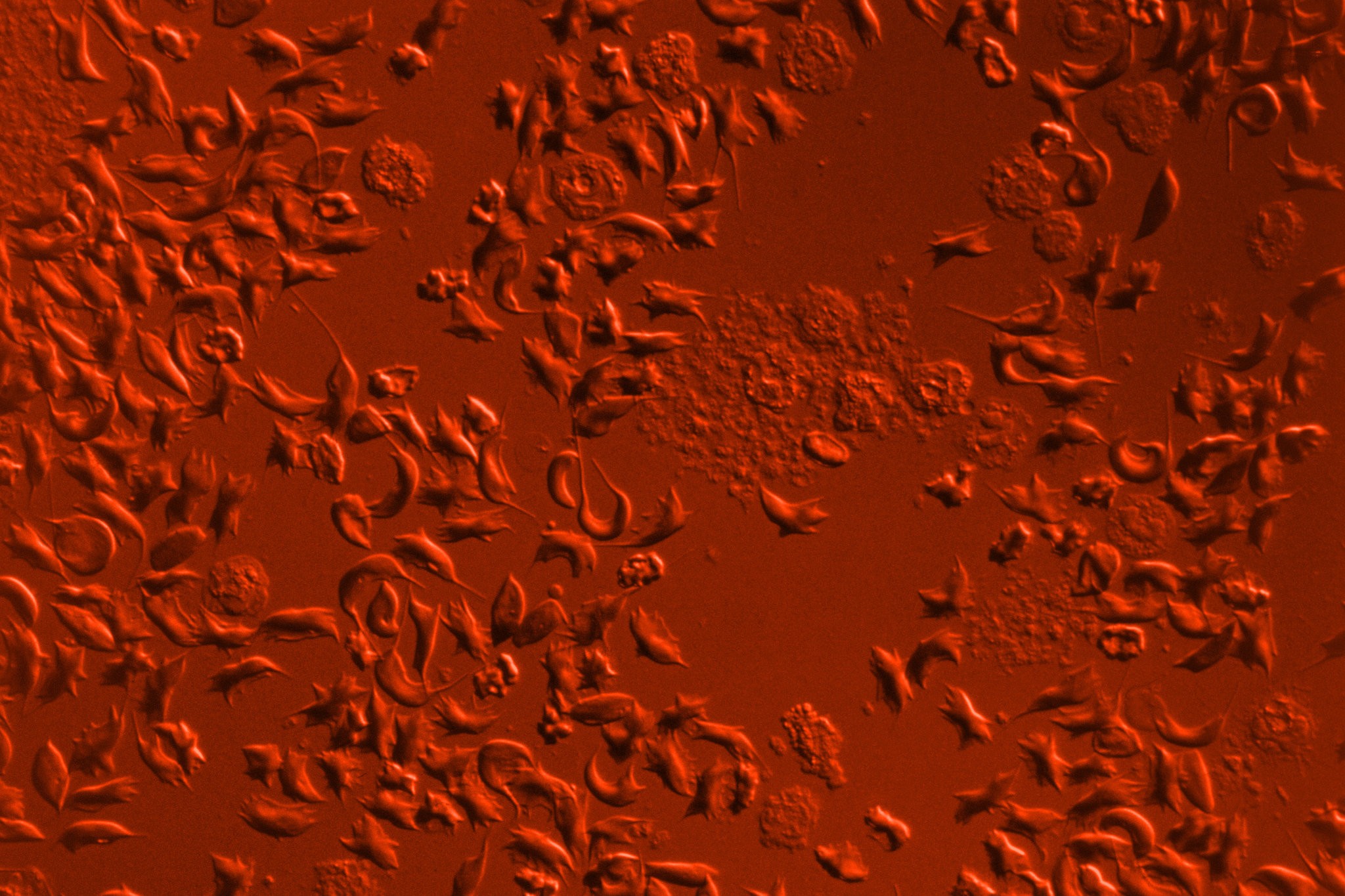 Sickle-shaped blood cells. The cells become lodged in blood vessels, causing strokes or excruciating pain as blood stops flowing. Photo courtesy of Omikron/Science Source