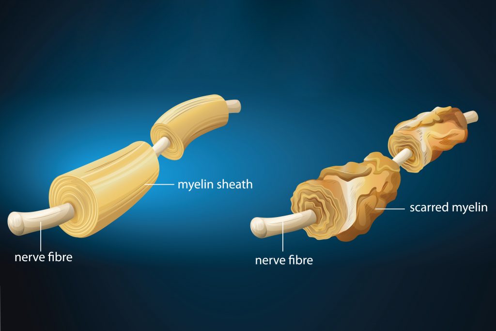 Drawing of a healthy nerve cell with insulation (left) and one damaged by multiple sclerosis (right). Image courtesy of Shutterstock