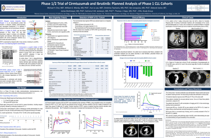 “These data presented today, taken together with an earlier Phase 1 study of cirmtuzumab as a monotherapy in relapsed/refractory CLL, give us increased confidence in the potential for cirmtuzumab as a treatment for patients with ROR1-expressing lymphoid malignancies, particularly in combination with ibrutinib as a potential treatment for patients with CLL and MCL. We believe that the data also help to validate the importance of ROR1 as a therapeutic target,”
