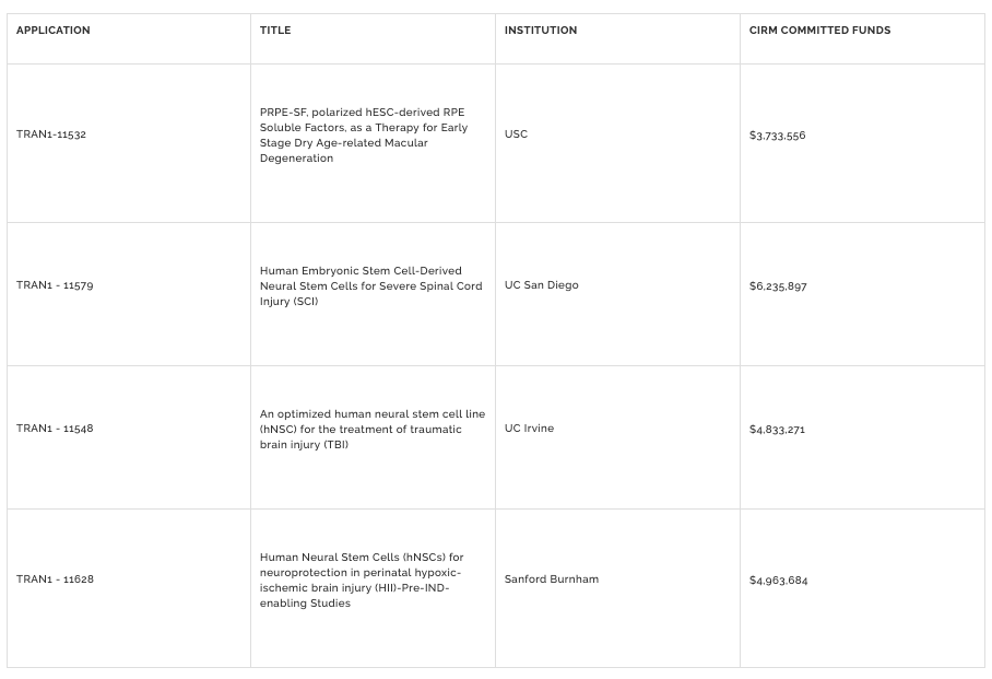 $6.23 million was awarded to Dr. Mark Tuszynski at UCSD to develop a neural stem cell therapy for spinal cord injury (SCI).
