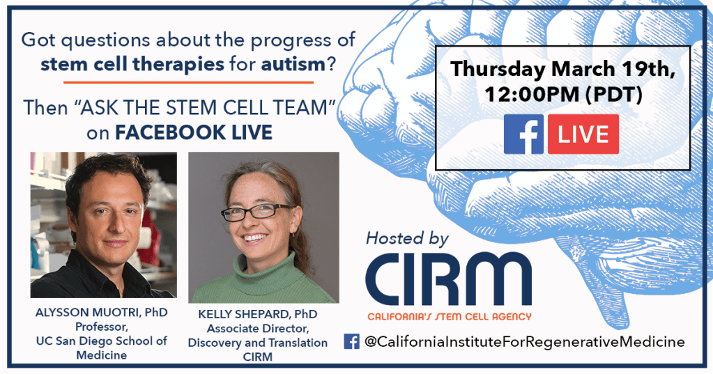 The event features Dr. Alysson Muotri from UC San Diego. We have written about his work with stem cells for autism in the past. And CIRM’s own Associate Director for Discovery and Translation, Dr. Kelly Shephard.