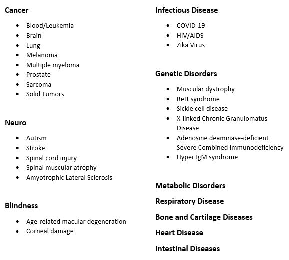 CIRM grants at UCLA have supported research related to many conditions, including the following: