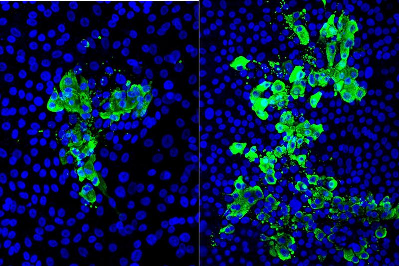 Microscopic images of human stem cell–derived airway tissue models with cell nuclei (blue) and SARS-CoV-2 virus infected cells (green); tissue exposed to cigarette smoke (right) had 2 to 3 times more infected cells than non-exposed tissue (left).