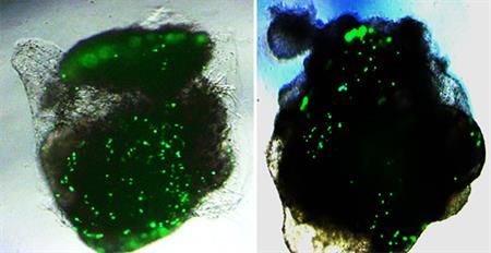 UC San Diego School of Medicine researchers found approximately 10-fold higher SARS-CoV-2 infection (green) in lung organoids (left), compared to brain organoids (right). Image courtesy of UCSD Health