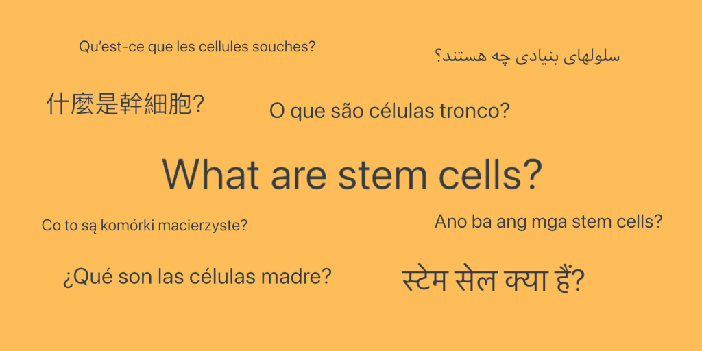 Naturally, I wasted no time and sent the Farsi version to my parents and the French one to my francophone mother-in-law. And it isn’t just me who is finding this information useful. Dr. Knoepfler says, “SCOPE has been a big hit and as the number of languages has grown, the number of page views of my white paper ‘What are stem cells?’ in languages besides English has skyrocketed. For example, just our Stem Cells in Spanish page has received over 680,000 views as of the first half of 2021, while our Indonesian page has over 300,000 views and our Arabic page has a quarter of a million. We are getting readers from all over the world who appreciate reading about stem cells in their own languages.”